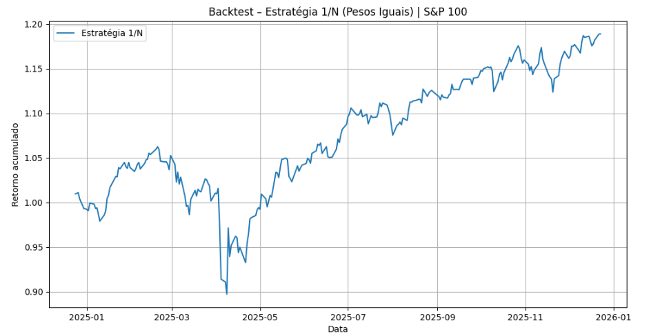 A implementação da estratégia 1/N neste trabalho considera um ambiente empírico realista, no qual o conjunto de ativos disponíveis pode variar ao longo do tempo. Dessa forma, em cada período, o retorno do portfólio é calculado como a média transversal dos retornos dos ativos disponíveis naquele instante, ignorando ativos que não possuam observações válidas. Essa abordagem reflete uma situação prática de mercado, especialmente em bases ajustadas por sobrevivência, e evita a imposição artificial de que todos os ativos estejam presentes em todos os períodos da amostra.