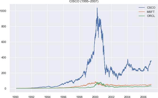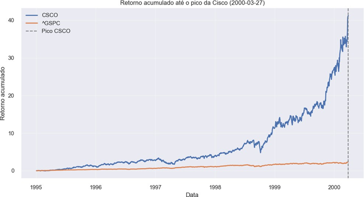 A distinção entre os dois ciclos se torna ainda mais evidente na análise da dinâmica corporativa. A partir de 1995, a Cisco Systems emerge como símbolo máximo da revolução da internet, com trajetória de preço altamente concentrada em um único pico especulativo entre 1999 e 2000, em forte contraste com o comportamento bem mais contido de Microsoft e Oracle no mesmo período. Esse padrão ajuda a caracterizar a bolha das dot-com como fenômeno centrado em um campeão setorial isolado, cuja valorização extrema não se propagou de forma homogênea para o restante do ecossistema corporativo.