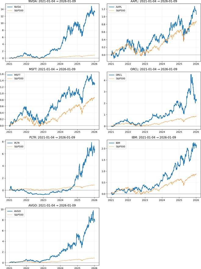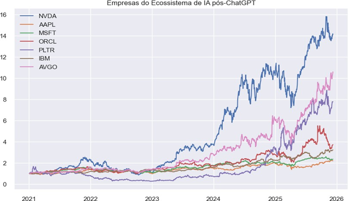 No ciclo atual de inteligência artificial, a dinâmica é mais distribuída: embora a trajetória da NVIDIA seja explosiva, com múltiplas ondas de valorização entre 2023 e 2025, outras empresas do ecossistema de IA, como Broadcom (AVGO), Palantir (PLTR), Microsoft (MSFT), Oracle (ORCL) e IBM, também exibem tendências de alta consistentes, ainda que em magnitudes distintas. A trajetória acumulada de retorno entre 2021 e 2026 mostra que a NVDA se destaca como líder absoluta em valorização, mas a alta não é isolada. Ações como AVGO e PLTR também exibem múltiplos de preço muito acima do S&P 500, enquanto AAPL, MSFT, ORCL e IBM apresentam desempenho superior ao índice em diferentes graus. Em vez de um único “superativo” desconectado, observa-se um sistema de empresas interconectadas por relações de fornecimento de hardware, software, serviços em nuvem e investimentos cruzados, como sintetizado no diagrama de fluxos de capital entre NVIDIA, OpenAI, Microsoft e demais players do ecossistema.