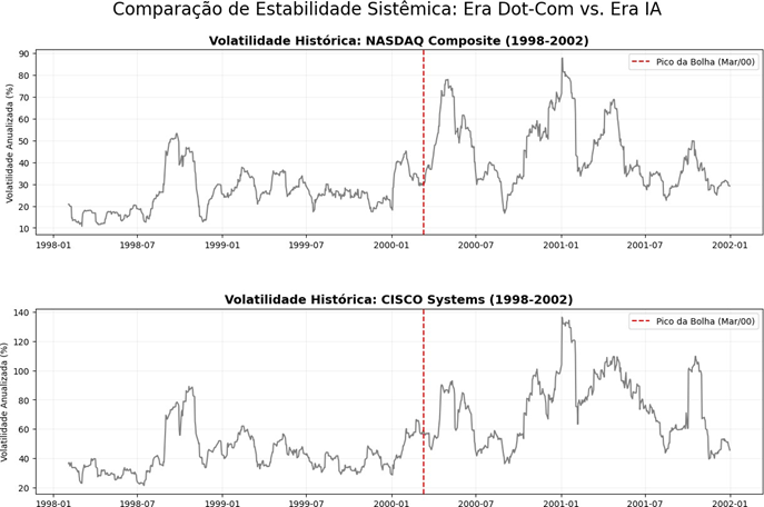 O mercado financeiro norte-americano experienciou, nas últimas três décadas, duas ondas tecnológicas de magnitude transformadora, a revolução da internet no final dos anos 1990 e a emergência da inteligência artificial generativa a partir de 2022. Esta pesquisa propõe uma análise histórico-comparativa entre os dois períodos, utilizando a Cisco Systems (CSCO) como proxy representativo da bolha dot-com (1999-2000) e a NVIDIA Corporation (NVDA) como proxy do atual ciclo de inteligência artificial (2021-2025), investigando se a IA contemporânea tem se comportado como um possível driver sistêmico do mercado.