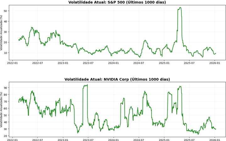 A correlação, também significativa, com o Ibovespa (r≈0,14; p≈0,0000) revela que o ciclo de IA nos Estados Unidos já transborda para mercados emergentes, inclusive o brasileiro, ainda que de forma mais amortecida. NVDA pode funcionar como proxy global de “risco tecnológico” e de expectativas quanto à produtividade futura, de modo que choques positivos na ação tendem a coincidir com janelas de fortalecimento do índice brasileiro, seja por melhora no humor global, seja por fluxo de capitais buscando beta em bolsas estrangeiras. A combinação de correlações moderadas, porém estatisticamente robustas com Bitcoin e Ibovespa, consolida o argumento de que a IA não é apenas um fenômeno setorial americano, ela passou a integrar o fator de risco global que liga ativos de fronteira tecnológica, criptoativos e mercados emergentes em um mesmo regime de apetite ou aversão ao risco.