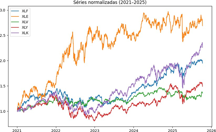 Foram utilizados retornos diários de preços de fechamento ajustados de dez ativos representativos, coletados automaticamente por meio da API do Yahoo Finance (biblioteca yfinance). O painel contemporâneo cobre o período de 2021 a 2025 e inclui cinco líderes do ecossistema de inteligência artificial, NVIDIA (semicondutores), Microsoft e Apple (plataformas), Palantir (analytics e software corporativo) e Broadcom (infraestrutura de chips), confrontados com cinco ETFs setoriais amplamente utilizados como proxies da economia real, financeiro (XLF), industrial (XLI), energia (XLE), consumo discricionário (XLY) e saúde (XLV).