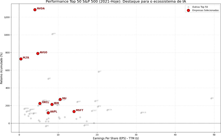 A análise cross-sectional dos 50 maiores componentes do S&P 500 reforça essa leitura de que o ciclo atual é menos isolado e mais integrado ao tecido corporativo. No gráfico de retorno acumulado desde 2021 versus lucro por ação (EPS), empresas do ecossistema de IA, especialmente NVDA, AVGO e PLTR, situam-se na região superior da distribuição, combinando múltiplos de valorização muito acima da mediana do índice com níveis de lucro que, embora não expliquem sozinhos o movimento de preço, não são negligenciáveis. Ao destacar essas empresas em relação às demais, observa-se que a “fronteira de performance” do S&P 500 no período recente é dominada por nomes ligados direta ou indiretamente à IA, ao passo que companhias tradicionais com EPS elevado, como bancos e industriais maduros, apresentam retornos acumulados bem mais modestos. Em conjunto, esses resultados sugerem que, ao contrário da trajetória altamente concentrada da Cisco em 2000, a inteligência artificial hoje atua como vetor de reprecificação transversal dentro do índice, redefinindo tanto a hierarquia de desempenho entre os blue chips quanto a forma como o mercado remunera crescimento esperado versus resultados correntes.