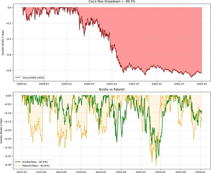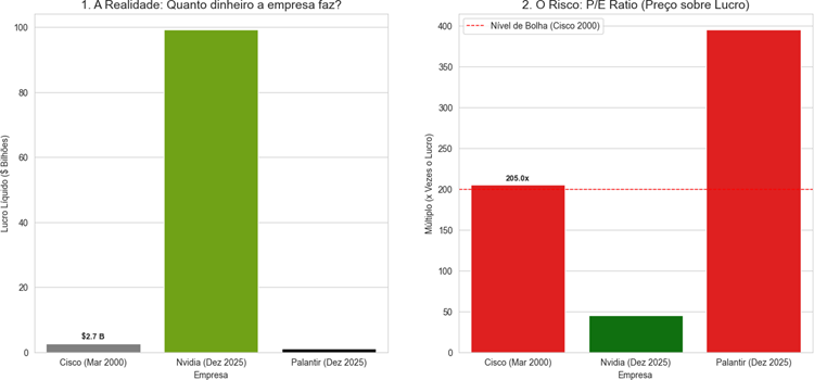 A decomposição entre “realidade” (lucro absoluto) e “risco” (P/E) torna essa distinção ainda mais clara. Em março de 2000, a Cisco gerava aproximadamente 2,7 bilhões de dólares em lucro anual e era negociada a cerca de 205 vezes esse resultado, múltiplo tipicamente associado a períodos de bolha. Ao contrastar esse nível com a Nvidia atual, observa-se um salto de ordem de magnitude na geração de caixa, algo próximo de 100 bilhões de dólares anuais, acompanhado de um múltiplo de lucro significativamente menor que o da Cisco em 2000, ainda elevado, mas compatível com uma empresa que combina crescimento acelerado com lucratividade excepcional. A situação de Palantir é o oposto, lucro ainda modesto e múltiplo acima da faixa de 400 vezes, superiores aos múltiplos observados para a Cisco no auge de 2000, o que indica alta sensibilidade a revisões de expectativa. Em síntese, enquanto a liderança de CSCO na virada do milênio se apoiava em lucro relativamente pequeno sustentando valuation extremado, o ciclo de IA é dual, há um núcleo de empresas com lucros robustos que justificam parte relevante do prêmio de preço, e uma periferia especulativa em que a precificação se aproxima, ou mesmo supera, os níveis de bolha observados no passado.