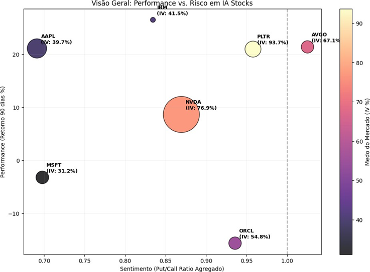 A análise conjunta de retorno recente, volatilidade implícita e posição relativa de puts e calls oferece evidência importante sobre a forma como o mercado precifica o risco no ecossistema de IA. No plano Performance × Sentimento, o eixo horizontal captura o put/call ratio agregado de cada ativo, medida de aversão ao risco, em que valores mais altos indicam maior demanda por proteção via opções de venda, enquanto o eixo vertical reporta o retorno em 90 dias, aproximando o investidor marginal que operou o rally recente. O tamanho das bolhas reflete a volatilidade implícita (IV) e a coloração sintetiza o “medo” embutido nas opções, tons mais quentes associam-se a IV mais elevada, logo maior prêmio exigido pelo mercado para carregar risco direcional.