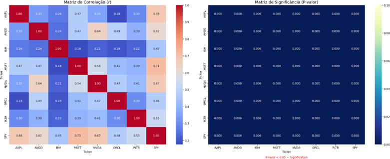 O código implementado fornece uma validação das relações entre ativos de inteligência artificial e o benchmark de mercado. A matriz de correlação revela relações positivas e substanciais entre todos os ativos analisados e o S&P 500, com coeficientes variando entre 0,45 (IBM) e 0,71 (MSFT), indicando influência ao índice. A matriz adjacente de significância confirma que todas essas correlações são estatisticamente diferentes de zero com p-valores inferiores a 0,001, rejeitando a hipótese nula de independência para toda a amostra.