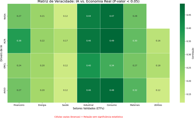 A matriz de veracidade integra correlações observadas entre as principais empresas de IA e ossete setores fundamentais da economia real, representados por ETFs, filtrando relações estatisticamente significativas via teste de permutação Monte Carlo com 10.000 simulações por par. Células verdes codificam correlações positivas robustas, enquanto células brancas sinalizam ruído estatístico.