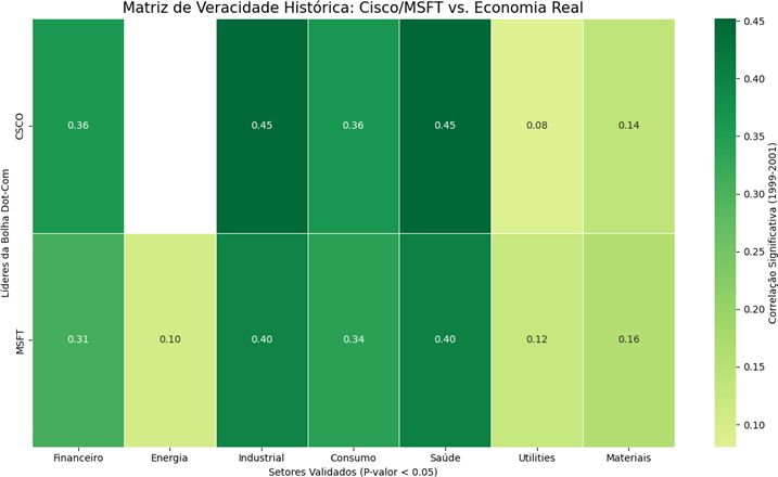 A análise setorial do período 2021-2025 sugere um padrão de transmissão fundamentalmente distinto do observado na bolha dot-com. Enquanto o setor de tecnologia (XLK) lidera a valorização, observa-se uma correlação positiva substancial com setores tradicionalmente não-tecnológicos, como Indústria (XLI) e Consumo Discricionário (XLY). Esta aparente diferença estrutural motiva a questão central desta pesquisa: a inteligência artificial representa um driver sistêmico genuíno do mercado contemporâneo, ou constitui um fenômeno setorialmente isolado com potencial de reversão análogo ao precedente histórico?