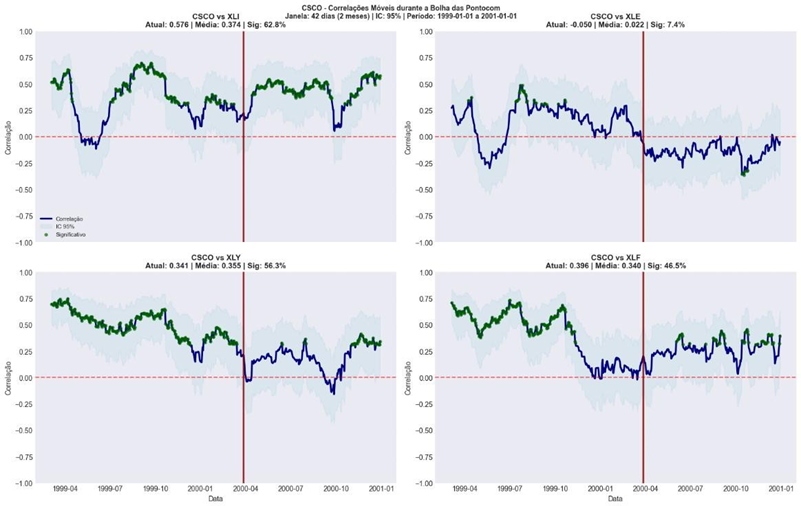 A Cisco apresenta correlação positiva relevante com o setor industrial, com média de aproximadamente 0,37 e significância em cerca de 63% das janelas. Contudo, o comportamento é oscilatório, alternando períodos de forte sincronização com quedas abruptas para níveis próximos de zero ou mesmo negativos. Essa instabilidade indica que o comovimento não se sustentava como um vínculo estrutural contínuo, mas sim como fases de entusiasmo cíclico associadas ao pico do investimento em tecnologia de rede.
