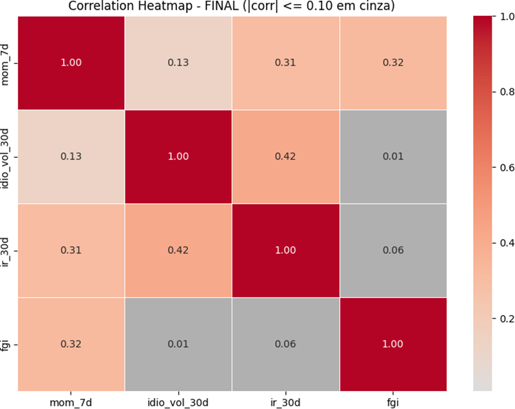Em contexto de mercados financeiros, é comum que diferentes variáveis carreguem informações semelhantes, fazendo com que resulte em alta correlação entre features, sendo esse fenômeno ser conhecido como multicolinearidade. Ter essa redundância excessiva entre features faz com que seja difícil a interpretação dos resultados e, no geral, amplificar ruídos já preexistentes. Nisso, consideramos como forma de mitigar a multicolinearidade a filtragem de features com níveis de correlação grandes. A filtragem acaba sendo simples, sendo primeiramente um cálculo de correlação entre das variáveis entre si, e filtrando qualquer variável com um nível de correlação maior ou igual à 0.25, assim fazendo com que reforçemos a ortogonalidade das features e mitiguemos a multicolinearidade.