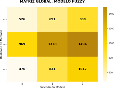 Ao compararmos as duas distribuições, fica claro que o erro do Modelo Normal é um erro de omissão, ele falha em agir, preferindo a neutralidade, enquanto o erro do Modelo Fuzzy é um erro de comissão, ele age na direção errada ao se deixar levar por vieses de tendência. No modelo normal, a soma dos acertos nas classes extremas (0 e 2) é de 1.362, enquanto no modelo fuzzy esse valor sobe para 1.543. Entretanto, a matriz fuzzy mostra uma distribuição de erros mais espalhada para a direita, indicando que a sua maior taxa de acerto bruto vem acompanhada de uma maior exposição a riscos de inversão de mercado.