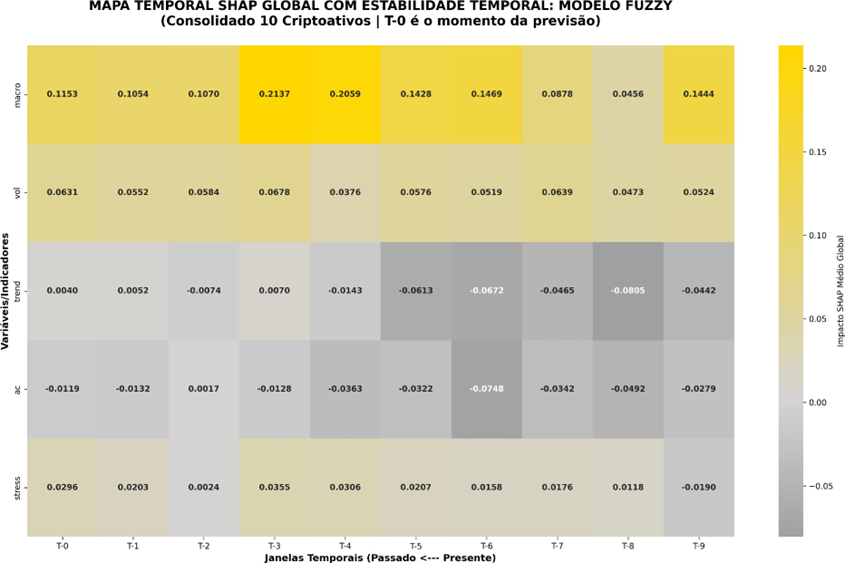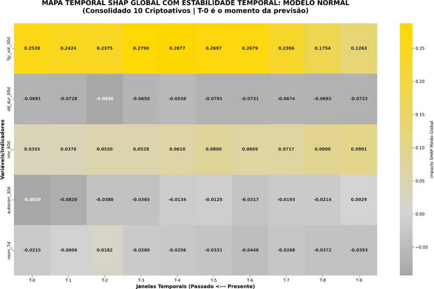 Figura 8 - Mapa Temporal SHAP Global com Estabilidade Temporal: Modelo Normal (Consolidado 10 Criptoativos | T-0 é o momento da previsão)