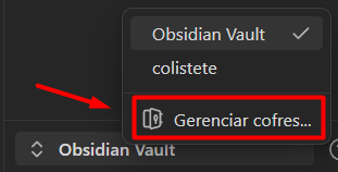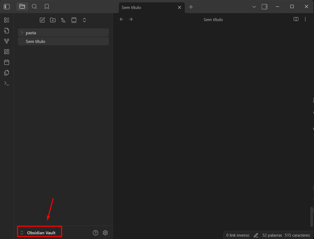 2- No canto inferior esquerdo, clique onde está escrito “Obsidian Vault” (se você já utilizar o Obsidian, clique no nome do vault que esteja ali)
