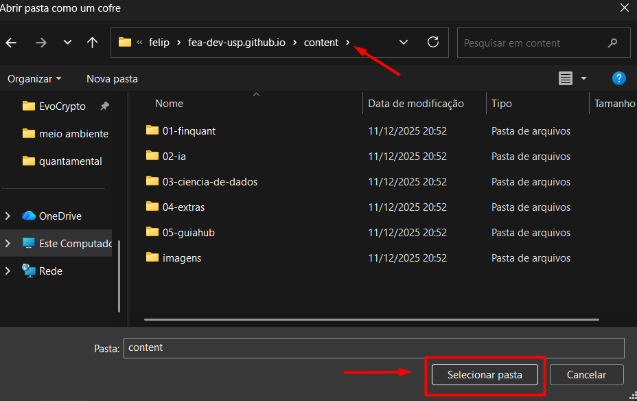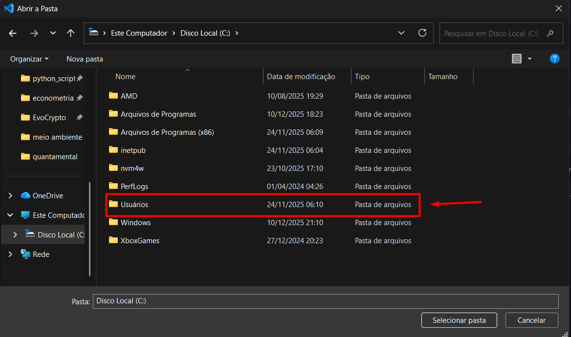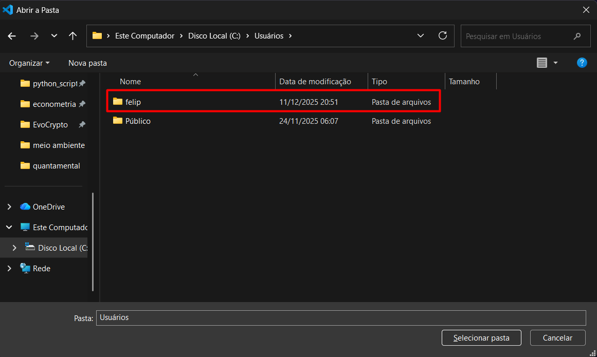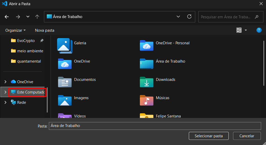 11- Com essa pasta aberta, clique em ‘Selecionar pasta’ (verifique na barra superior se o caminho é parecido, o que deva divergir seria apenas o nome do usúario);