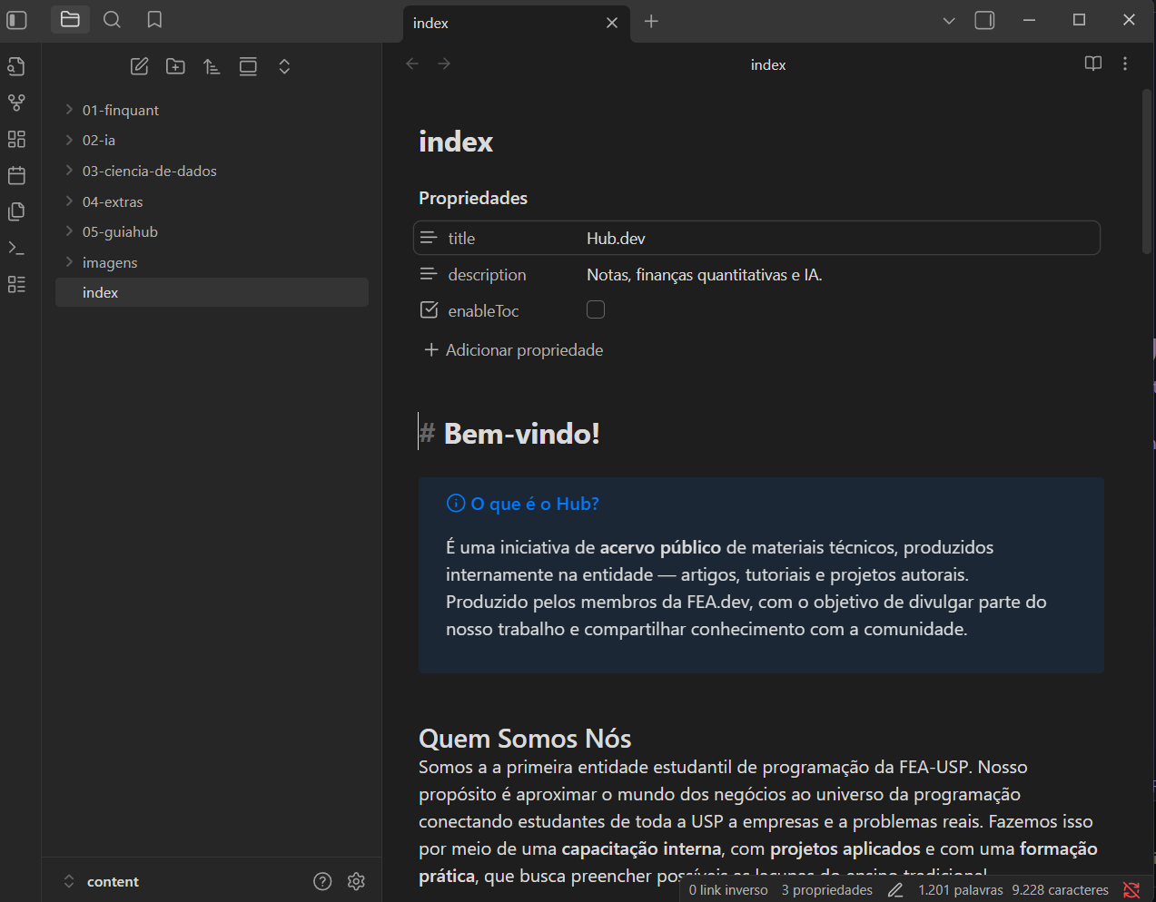 12- Você estará vendo toda a estrutura do Hub dentro do Obsidian (a estruturá poderá estar diferente no momento que você esteja vendo, mas em suma deverá aparecer algo parecido);