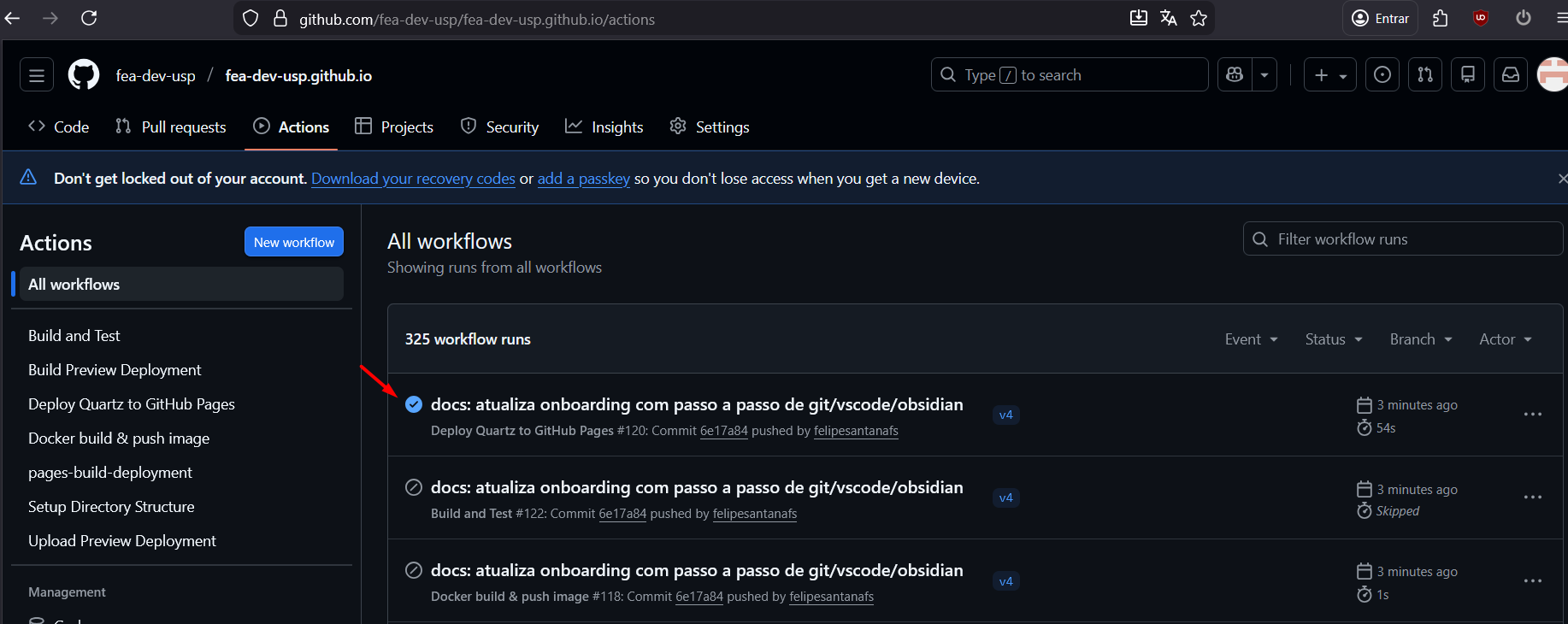 7- Vamos checar se as mudanças foram feitas corretamente e lá no Github, acesse: https://github.com/fea-dev-usp/fea-dev-usp.github.io/actions