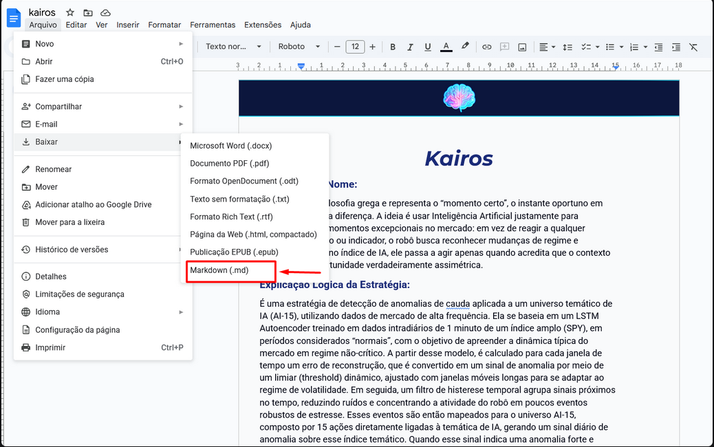 3- Clique em seguida em Baixar e depois selecione em Markdown (.md):